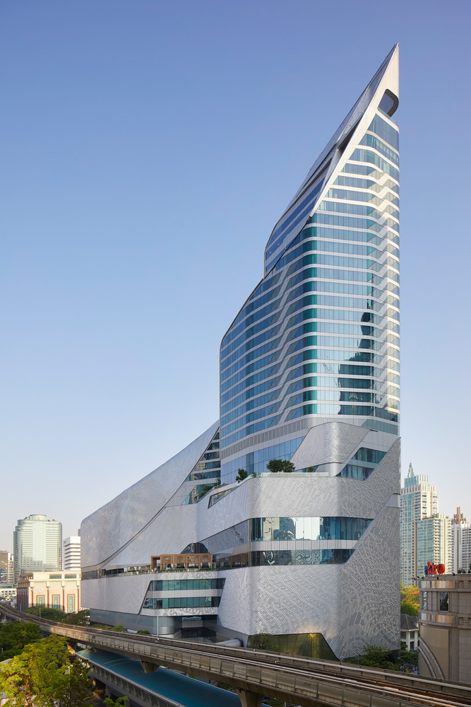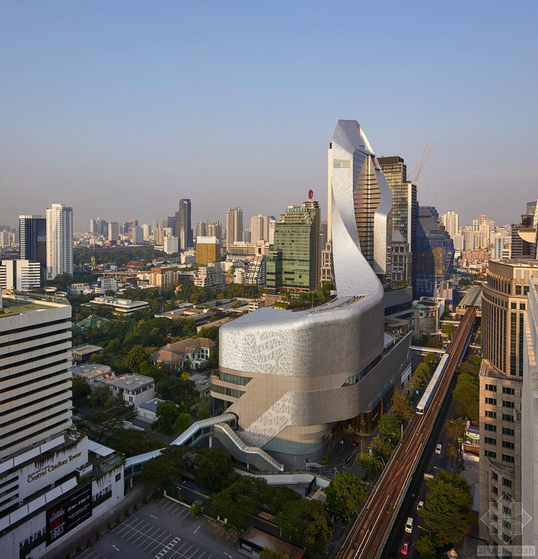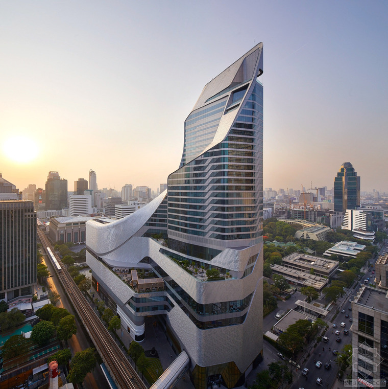 曼谷中心大使館為曼谷這座城市帶來(lái)了全新的印象,無(wú)論是從街道還是從天際線來(lái)看,它都展示出一種邀請(qǐng)的姿態(tài),歡迎曼谷人和全世界人來(lái)參觀。項(xiàng)目位于之前英國(guó)大使館的花園中,沿著曼谷最重要的商業(yè)干道 Ploenchit 大路,占地150萬(wàn)平方英尺(約139萬(wàn)平方米)的綜合體包括一個(gè)7層的奢侈品零售區(qū)和27層的五星級(jí) Hyatt 酒店塔樓。這座塔是第一個(gè)英國(guó)建筑師在泰國(guó)完成的項(xiàng)目。酒店和購(gòu)物中心使用連續(xù)循環(huán)的形式,使裙房和塔樓更直接的結(jié)合在一起。塔樓連續(xù)的線條似乎打破了裙房的大體量,在尺度上創(chuàng)造了一種非對(duì)稱的結(jié)構(gòu)。這種形式的開(kāi)放,包容了城市并且建立了一種相互的視野,一系列的室外平臺(tái)和露臺(tái)可以看到彼此。兩個(gè)垂直的光井,完全的打開(kāi)塔樓內(nèi)部空間,可以看到層層疊疊不斷向上變化的平臺(tái),同時(shí)這些平臺(tái)又劃分了酒店的功能:面對(duì) Nai Lert 公園的私人會(huì)客空間、酒吧、接待休息室和面向市中心的天臺(tái)。