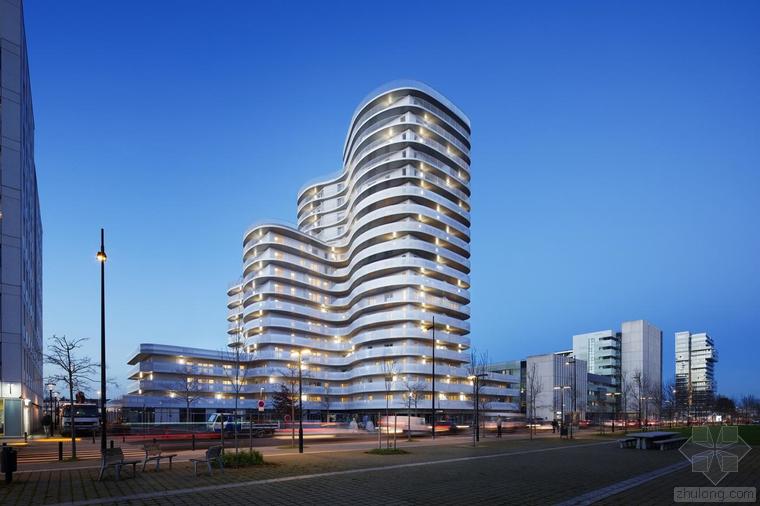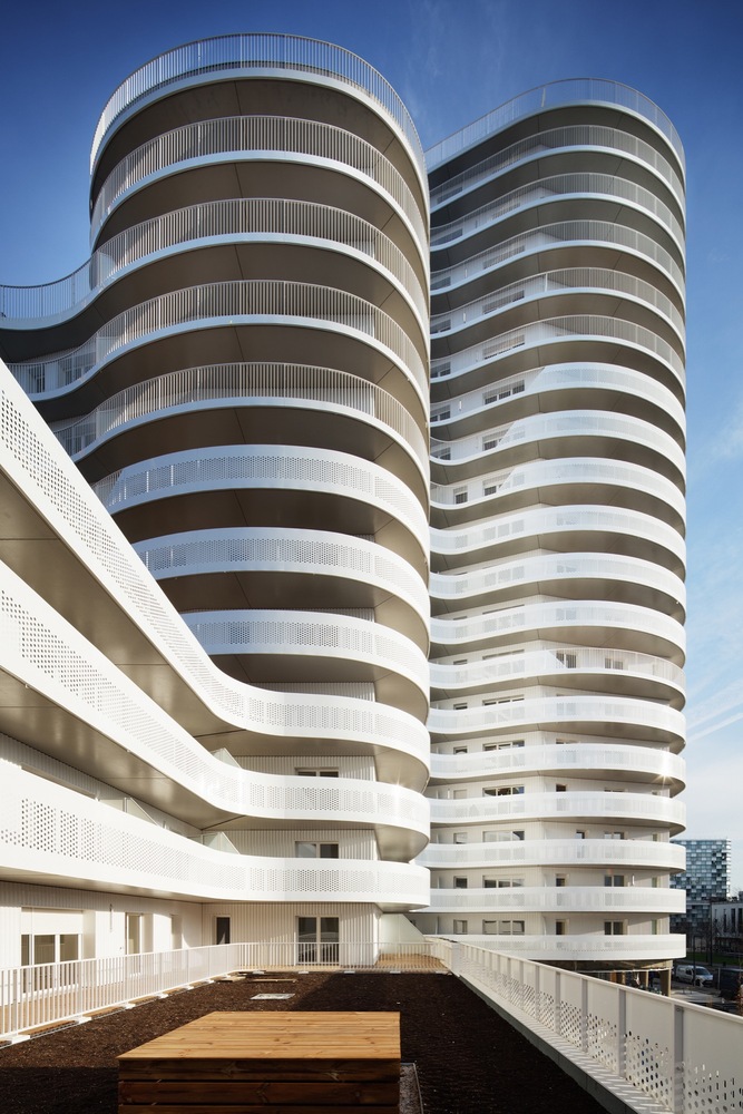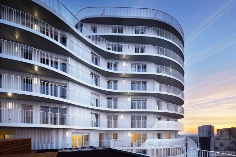 這是一棟建造于核心區(qū)位的獨(dú)特建筑。New’R大樓由流線型的折角和四周波浪起伏的陽(yáng)臺(tái)構(gòu)成,這樣的造型設(shè)計(jì)不僅是在向奧斯卡•尼邁耶致敬,還是在向上世紀(jì)七十年代法國(guó)里維埃拉的建筑(例如由André Minangoy 和 Michel Marot設(shè)計(jì)的天使灣碼頭)致敬,最后還暗示了快樂(lè)主義者對(duì)邁阿密海灘的幻想。這座建筑顯得感性而又賦有多向性,其所在位置在“畢加索郵路”和目前沿鐵路基礎(chǔ)設(shè)施設(shè)置的、尚處于開發(fā)階段的新住區(qū)之間的重要節(jié)點(diǎn)上。New’R大樓對(duì)現(xiàn)有場(chǎng)地的構(gòu)建體現(xiàn)在對(duì)基地形成的環(huán)擁之勢(shì)和對(duì)新景觀的塑造。